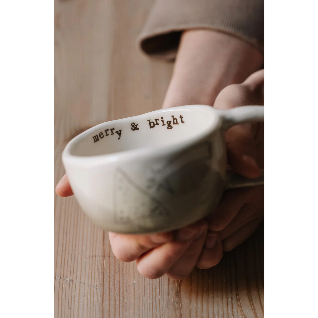 Ručno izrađene šalice prepoznatljivog izgleda - neutralne boje, predimenzionirane ručke, točkice, srca, natpisi. Preporučeno je ručno pranje.